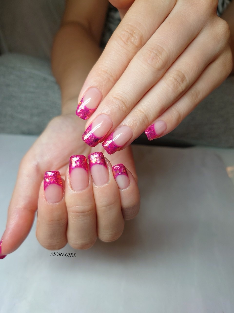 夏に人気のビビットなピンクをフレンチにしてフレークでキラキラに✨