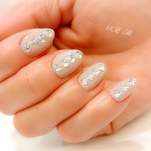 2021/03/21おはようございます。 モアガール表参道です。 本日は、キラキラなストーンネイルをご紹介いたします(^^) 肌なじみの良いベージュに、 オーロラストーンをたてに並べたシンプルかつ、華やかなデザイン(^^) 皆さまも、是非♪