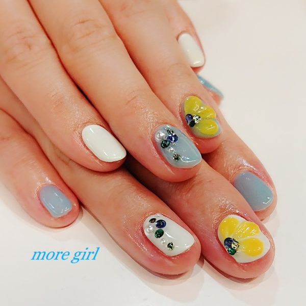 2019/06/08おはようございます。 モアガール表参道です(^^) 本日は、夏色フラワーネイルをご紹介致します! ブルーとホワイトで、とっても爽やか! 夏にピッタリです(^^) 大きめパールとストーン&ラメでキラキラ感も♪ 人気 …